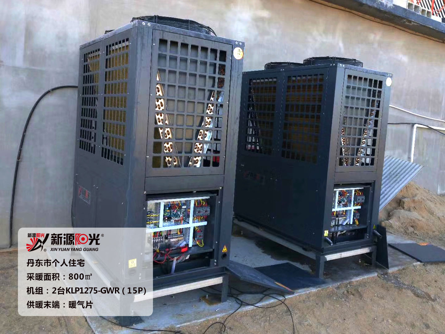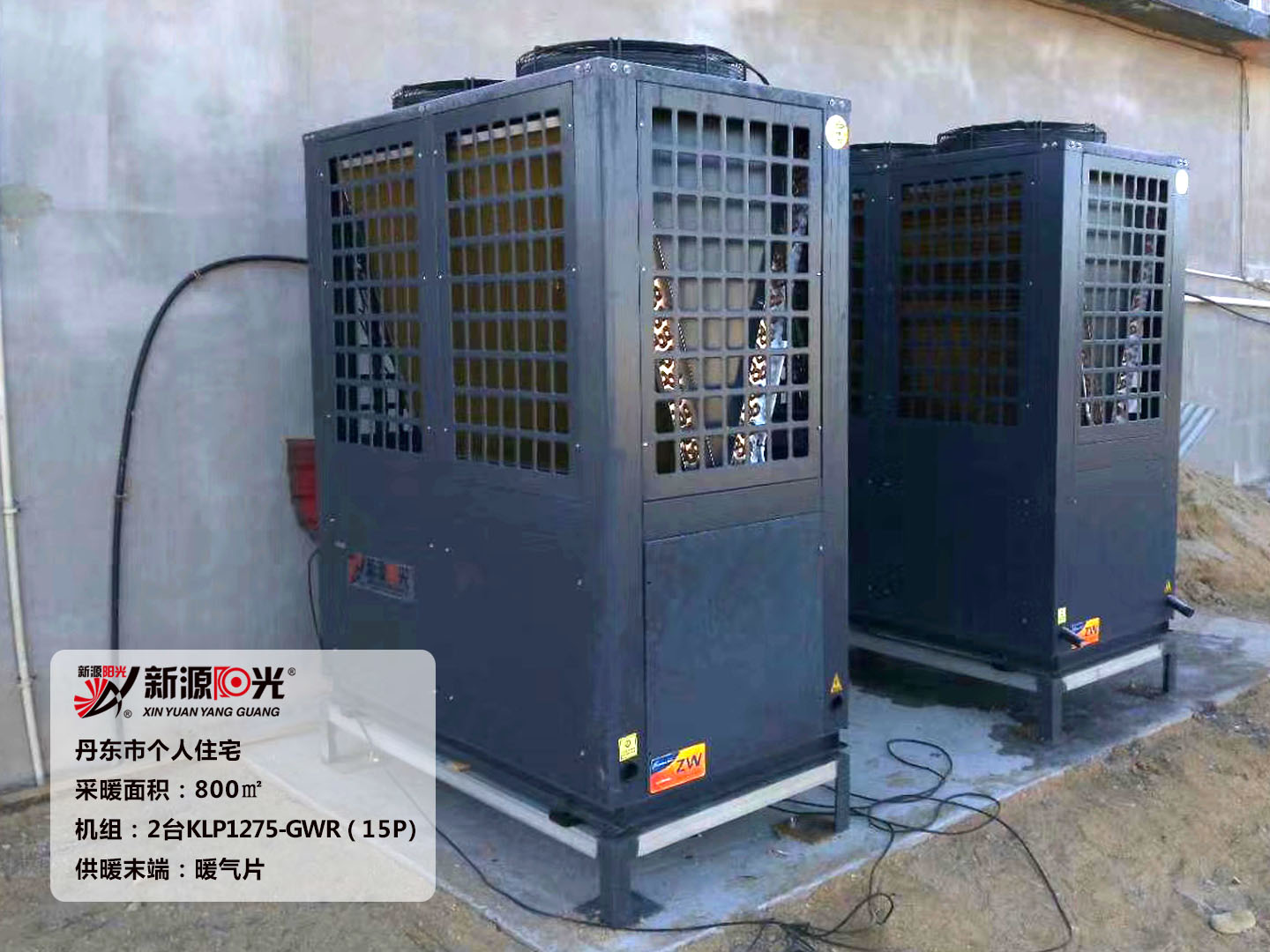 供暖面積:800㎡ 機(jī)組:新源陽(yáng)光15P空氣能熱泵機(jī)組 采暖末端:暖氣片+地暖